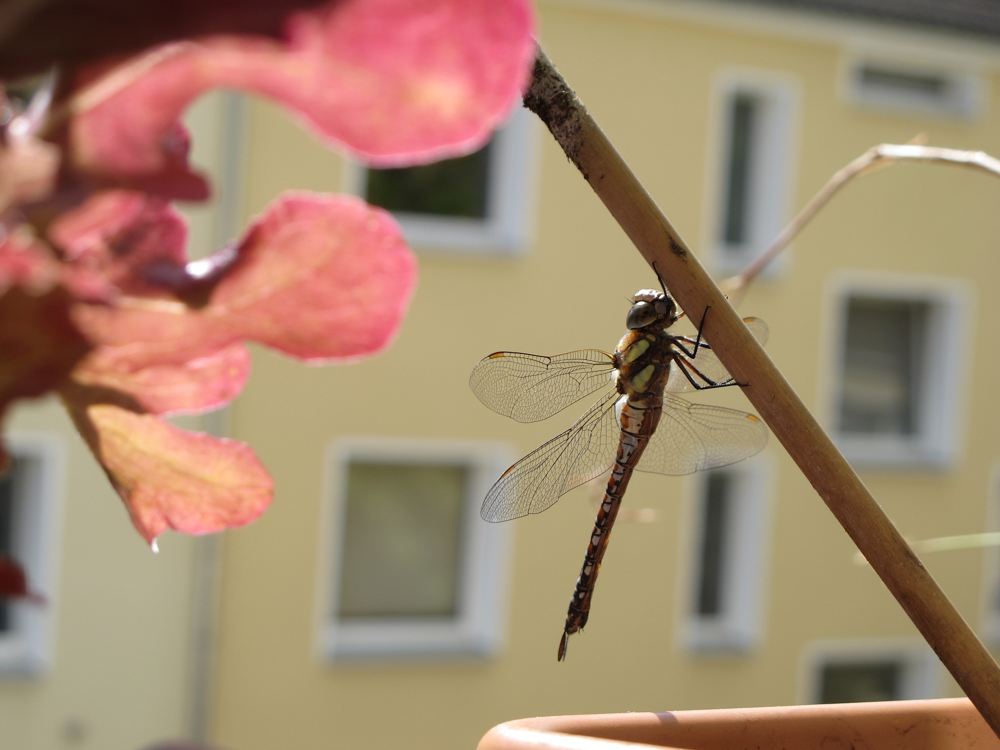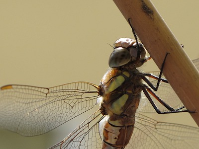 Was das angeht, war eine Libelle 2016 wesentlich kooperativer. Ich konnte sogar näher rangehen und dadurch die feinen Details in ihren Flügeln fotografieren. Sie hing auf einem Landen-Verboten-Stock auf der Straßenseite und tankte Sonne. Der Stock hat rund einen Zentimeter Durchmesser, entsprechend war der Kamerad sicher 10 Zentimeter oder länger.