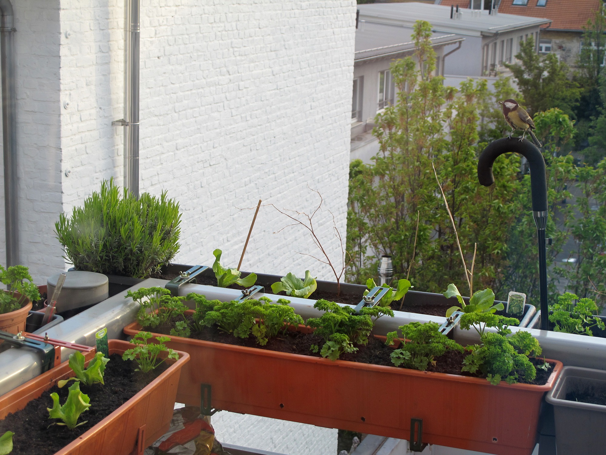 Den umgedrehten Regenschirm hatte ich eigentlich für die Amsel als Chefsessel eingerichtet, damit sie nicht immer in den Kästen sitzt und dort meine Setzlinge vollkackt. Wobei ich mit kleinen Hinterlassenschaften noch hätte leben können, aber wenn sie sich zwecks Luftraum-Überwachung drehte, beschädigte ihr Höhenruder empfindliche Setzlinge. Der Regenschirm hat bei der Amsel nicht gezogen, dafür wurde und wird er von den Meisen ausgiebig genutzt.